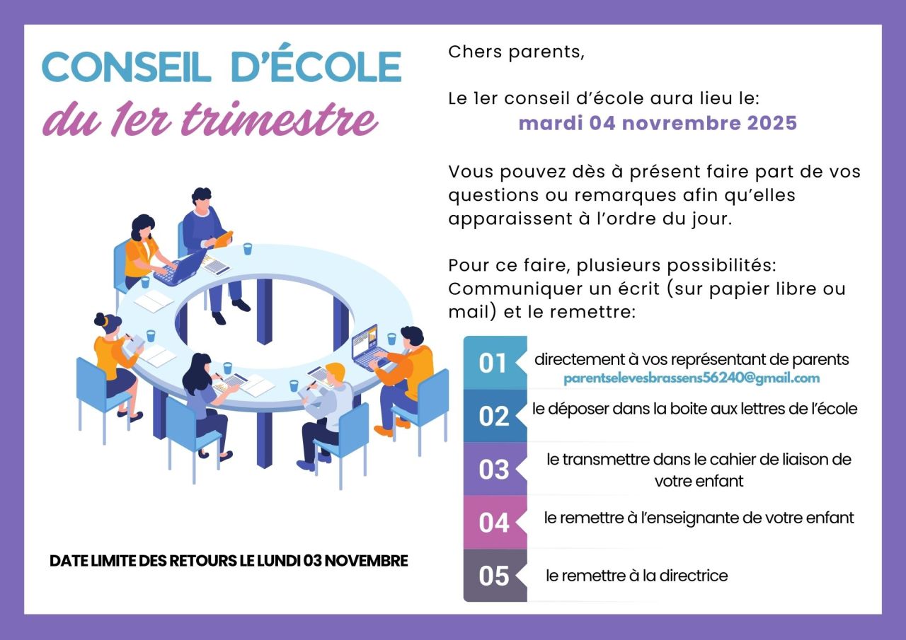 Le 1er conseil d'école de l'année scolaire se tiendra le mardi 04 novembre 2025.