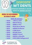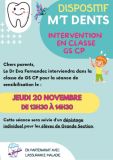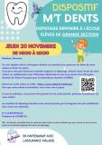 Un professionnel de santé interviendra dans la classe de GS CP dans le cadre du dispositif M'T dents le jeudi 20 novembre 2025 de 13h30 à 14h30.